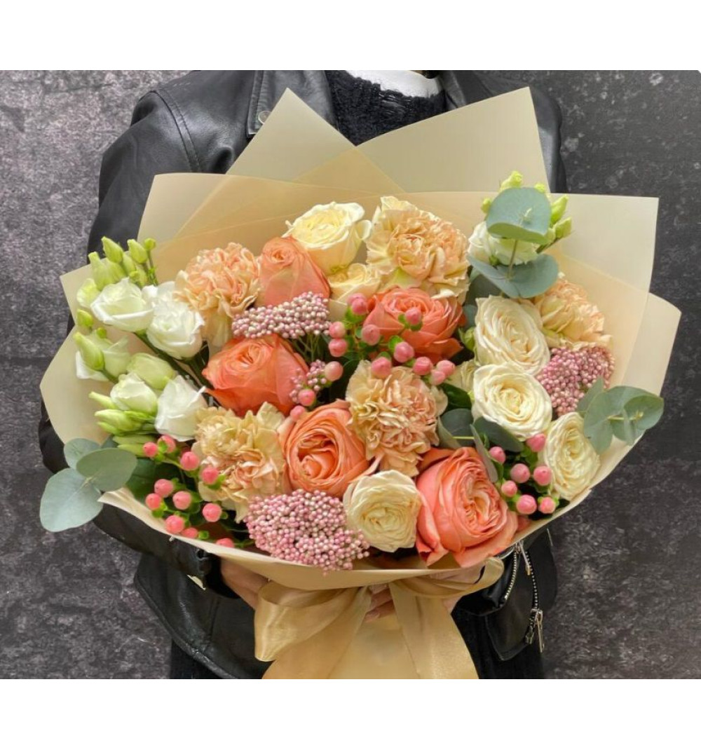 Пионовидные розы и озотамнус в этом букете образуют прекрасное сочетание изящества и свежести. Многослойные лепестки пионовидных роз придают ему особый шарм, а ароматный озотамнус добавляет приятные ноты. Этот уникальный букет создаст атмосферу романтики и красоты, станет чудесным подарком для особых моментов и создания незабываемых впечатлений с вашими близкими.