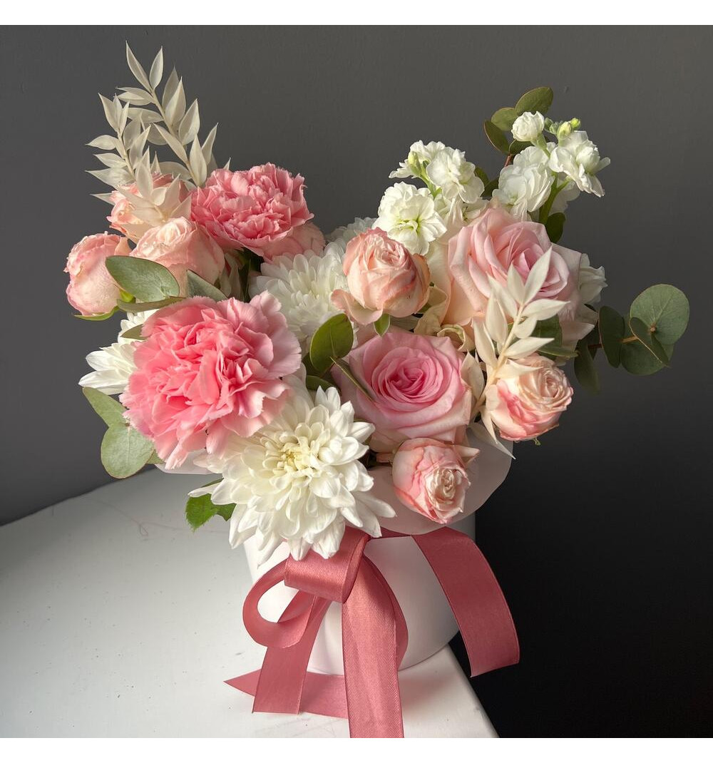 Кустовые пионовидные розы, маттиола и хризантема в шляпной коробочке