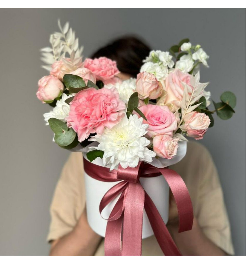 Этот элегантный и изысканный букет сочетает в себе прекрасные пионовидные розы, нежные цветы маттиолы и яркие хризантемы. Букет создаст атмосферу роскоши и изыска в любом интерьере и станет прекрасным подарком на любой праздник. Шляпная коробочка придаст букету особый шарм и оригинальность, что сделает его еще более уникальным и запоминающимся. Кустовые пионовидные розы, маттиола и хризантема - это сочетание красоты, нежности и свежести, которое подарит массу положительных эмоций и радости.